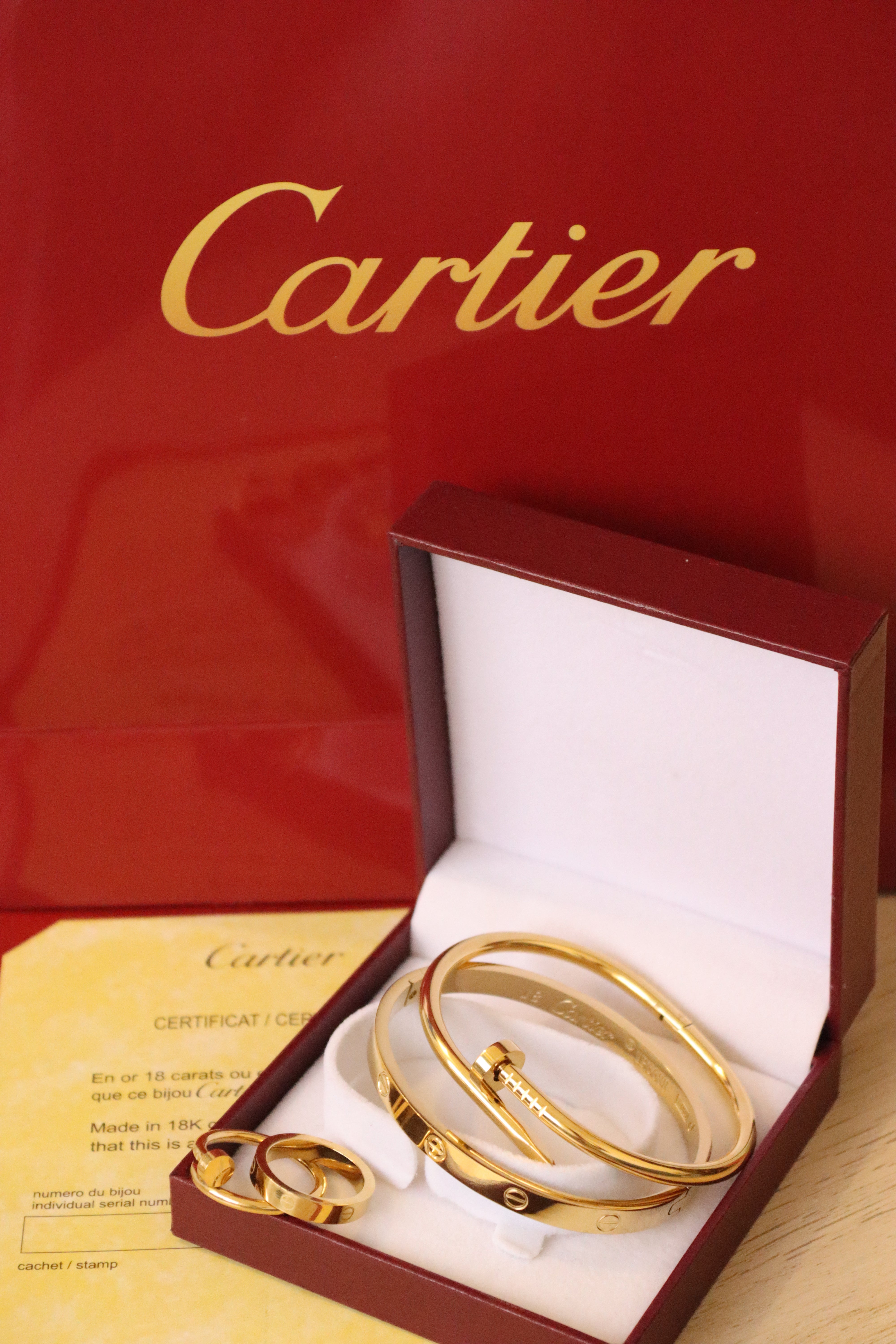 طقم كارتيير باللون الذهبي مكون من اسوارتين و خاتمين ، مكفول لمدة سنتين ، مرفق معه كرت كفالة و علبة و كيس شركة
